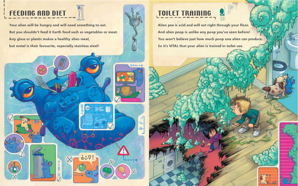 While the monsters’ guide is written in the style of an instruction manual, the aliens’ guide is written in the style of a pet-care handbook. To get a feel for how these are organised and written I went to my local library and borrowed most of their collection of pet-care books. I made a wide selection, ranging from ordinary pets, like cats and dogs, to more exotic creatures, like spiders and snakes. When I took the books to the counter I was anticipating some comment from the librarian about my apparent indecisiveness or whether I was planning to open a small zoo, but she didn’t raise an eyebrow.